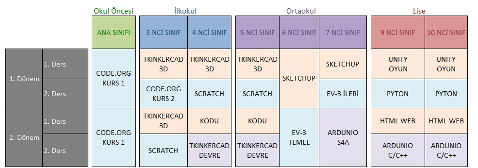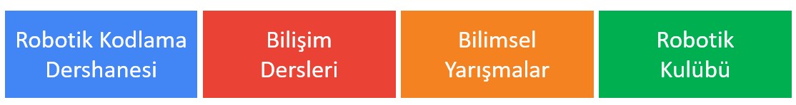 Robotik Kodlama Dershanesinde verdiğimiz bilişim derslerimiz sadece robotik kodlama ile kısıtlı değildir. Bilişim becerileri kazandırmak için geliştirilen Robotik Kodlama Modelimiz ana sınıfından 10’uncu sınıfa kadar tüm öğrencilere verilen çeşitli bilişim derslerini kapsamaktadır. Bu dersler öğrencilerimize dijital tasarım, kodlama, mekanik, elektronik ve robotik becerilerin kazandırılmasını hedeflenmektedir. Ayrıca verilen haftalık müfredata ek olarak anlatılan bilişim derslerimizde kendini daha fazla geliştirmek isteyen öğrencilerimiz kulüp çalışmaları ile desteklenmektedir.